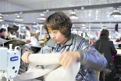 12月16日,工人在内蒙古化德县一家服装公司车间工作。目前,化德县有絮片生产厂家27家,服装生产厂家240多家,从业人员超过2.5万人,年生产服装超过2500万件,实现产值16亿元,从业人员人均收入超过2.5万元。 新华社记者 任军川 摄