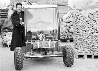 12月13日, 河北大城退休工人朱占福在自家农家院里展示自制的“汽车”。