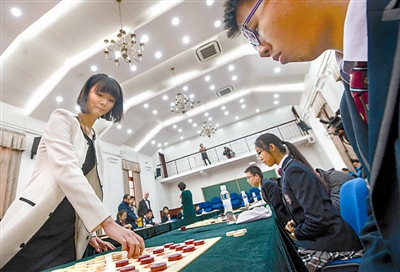 当日,在北京参加2013年世界智力精英运动会的国际跳棋形象大使赵汗青和阿姆河·特卡琴科走进北京四中,和爱好国际跳棋的学生们一较高下,推广国际跳棋运动。