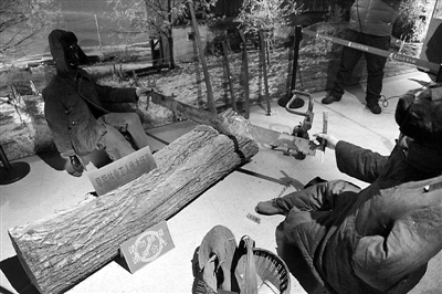 12月17日,《龙江森工特展》在黑龙江省博物馆开幕,在展示黑龙江省丰富的林业资源的同时,唤起人们的绿色环保意识,呼吁人们保护森林。图为早期伐木工人伐木的模拟场景。