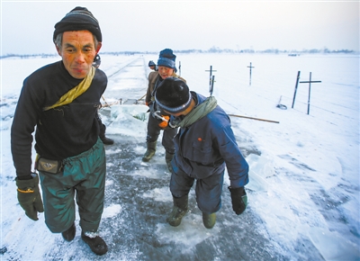 退雪、割冰、炸冰、捞冰直到最后装车,每一个步骤都需要过硬的体力和技术。采冰队有60多人,每天凌晨4点多钟就要开始干活,在冰面上一站就是一天,江风吹起来像刀子一样割在脸上手上,晚上回到临时搭建的工棚里才发现脸上手上全是裂开的小伤口。“每年的采冰期就这十几天,一天一百五六十元钱,最后能有几千元的收入,这可比在家闲着好多了。而且也快过年了,谁不想最后多挣点钱舒舒服服过个好年呢?”