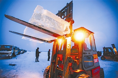 图为采冰人在凛冽的寒风中忙碌。晶莹剔透、规格统一的冰块将被运往“冰雪大世界”。