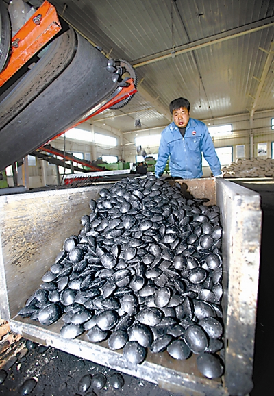 12月19日,河北省廊坊市安次区旺冬燃料有限公司的工人在生产环保型煤。