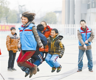 12月17日,志愿者与玉树孤儿一起跳绳。