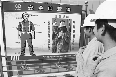图为该公司深圳地铁11号线项目经理部员工在“自查镜”前进行安全自检,认真落实地铁工程“工厂化、城市化、标准化”施工要求,提升现场文明施工水平。