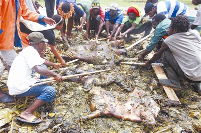 当地时间2013年12月12日,在印尼的巴布亚村有一种传统的烤猪大餐,村民会用棍棒将一头猪活活打死,然后用特制的“烤箱”做成一顿美餐。把死猪从车后厢里卸下来之后,他们会先在地上挖一个洞,里面填上草和树叶,再铺一层在火堆里烧红了的石头。“烤箱”做好之后,村民们就把猪分割了放进去,先铺一层猪肉,上面撒一些草和石头,然后再铺一层其它的食物,如土豆和玉米,然后上面再盖一层草和石头,最终会堆到半个人那么高,完了之后再耐心等待几个小时,一顿美味大餐就可以出炉了。东方IC 供图