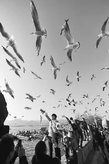 这是人们在昆明滇池草海大坝喂食红嘴鸥。来昆明越冬的红嘴鸥,经158名工作人员在62个点同步统计,今年冬天的数量约39230只,创历年之最。