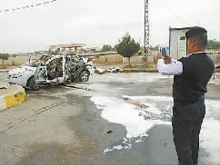12月4日,在伊拉克基尔库克,一名警察拍摄汽车炸弹爆炸现场。该地当天发生一起汽车炸弹袭击,造成1人死亡、3人受伤。