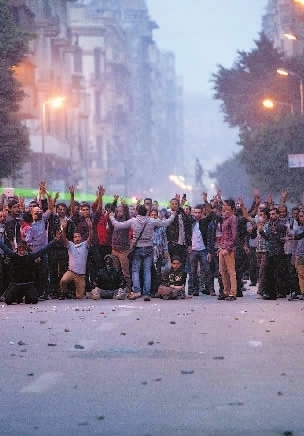 12月1日,在埃及首都开罗解放广场,示威者在催泪瓦斯的烟雾中继续游行示威。