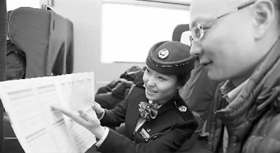 12月28日零时起,中国铁路总公司将实施新的列车运行图,济南客运段高铁十六组的乘务员樊玉正在向旅客介绍28日调图后的变化和增开的车次,以方便旅客出行。张明华 摄
