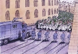 手捧干枯花木的人群,呼喊着“缺水!”口号勇往直前。队伍见到军警的水龙头,恰似瞌睡者遇到送枕头的可心人。