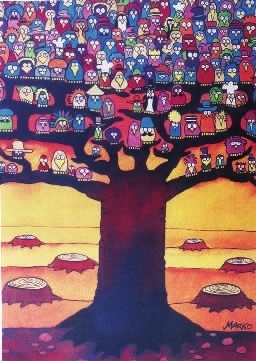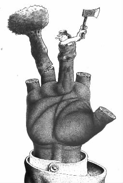 批评乱砍滥伐的漫画虽不少见,而将无知的挥斧者和无辜的大树干,比拟成一脉相承的“骨肉”实属稀罕。画家在呼唤:手下留情!