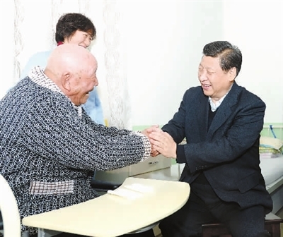 右图为习近平在北京市海淀区四季青敬老院看望五保老人刘岐时同他握手交谈。 新华社记者 李学仁 摄
