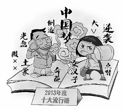 著名语文刊物《咬文嚼字》12月18日发布了“2013年十大流行语”,分别是中国梦、光盘、倒逼、逆袭、女汉子、土豪、点赞、微XX、大V、奇葩。