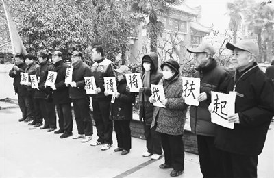 2013年12月25日上午,河南省郑州市,10名老人聚在一起,一字排开,每人手中举起一个字牌,连起就是“倘若我摔倒,请将我扶起”10个大字。他们举着站着,保持沉默,如同雕塑。引来不少市民围观。