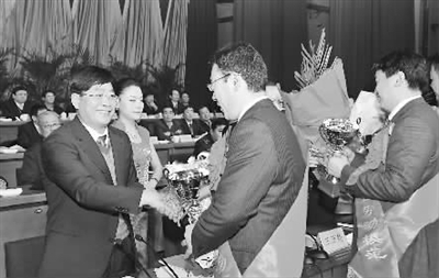 中原石油勘探局局长 、 油田分公司总经理孔凡群在职代会上为劳动模范颁奖 。
