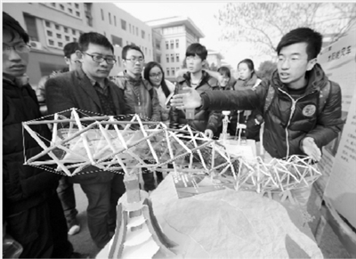 12月20日,东南大学举行2013年大学生创新创业成果展示化。400多件学生科技作品及项目成果参展。图为土木工程学院几名学生制作的游乐场娱乐设施模型“海之龙”吸引了参观者。