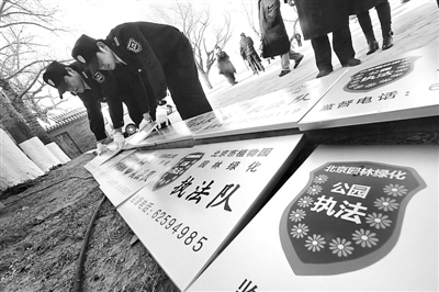 2013年12月30日,北京首支具有处罚权的公园执法队成立。来自北京市公园管理中心的消息,从今年元旦起,这支执法队将在颐和园、天坛、北海等市属11家公园上岗,对违反相关公园管理条例的个人实行行政处罚。 杨益 摄/CFP