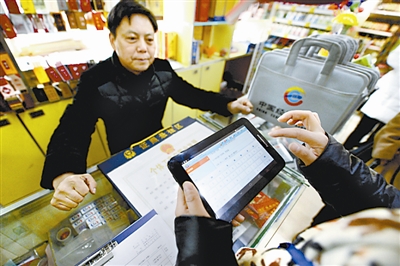 1月1日,在合肥市笔架山街道一处超市内,普查员利用手持电子终端设备(PDA)录入经营户相关普查数据。