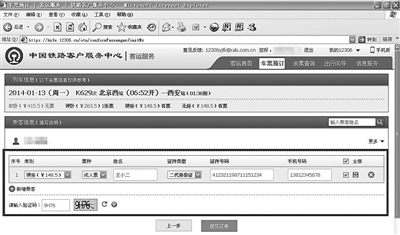 当确定购买的车次后,点击预订按钮就进入了购买页面。确认席别以及票种,勾选已存在的乘客信息或重新填写乘客信息,输入验证码后提交订单。