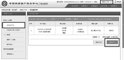 提交订单后可以继续预订返程车次或者直接进入车票的支付页面。如没有立即进行支付,可以进入页面右上角我的12306中未完成的订单,查找自己的订单信息。