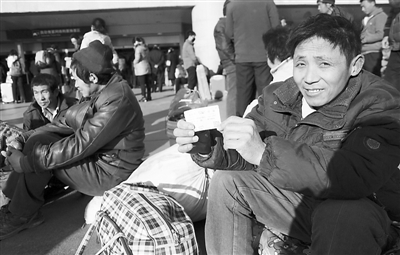 2013年12月29日,北京西站广场,来自湖北的农民工展示车票。随着新年临近,北京西站迎来大批返乡的农民工,他们扛着一年辛苦劳作换来的收获,回家过年。 CFP供图