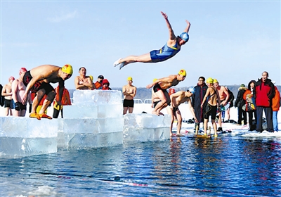 2014年1月1日,冬泳爱好者在参加冬泳比赛时跃入水中。当日,2014中国沈阳国际冰雪节迎新年冬泳铁人三项赛在沈阳棋盘山冰雪大世界举行。辽宁省百余名冬泳爱好者通过冬泳、滑冰车、跑步三项比赛挑战严寒,快乐健身。 新华社发 (张文魁 摄)