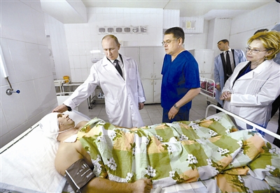 2014年1月1日,俄罗斯总统普京(左一)在俄南部城市伏尔加格勒的一所医院内慰问爆炸受伤人员。