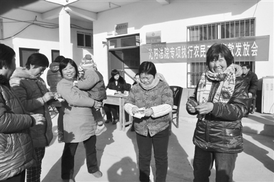 2011年6月,肖寺村49名农民工经人介绍到邻近的一家企业打工,由于企业经营亏损,发生了欠薪问题。2012年6月,企业给农民工们出具了一张8.3万余元的工资欠条。该案起诉到法院后,法官多次调解,企业也分批给付了部分欠款,但剩余的近2万元工资一直没有足额支付。2013年12月底,经过法官多次协调,企业终于将剩余欠薪交到法官手中,并请法官协助发放。图为农民工刘大嫂领到欠薪时的情形。