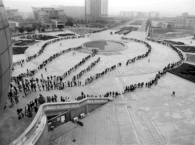 2014年1月4日,南京财经大学图书馆门前,学生们一大早就在寒风中排起长队,场面壮观堪比春运。