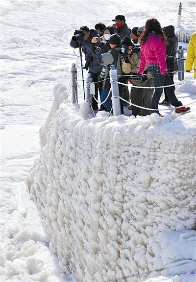 隆冬时节,位于晋陕大峡谷的黄河壶口瀑布仍奔流不息,由于气温低,冲到河岸的河水形成冰挂。别样的壶口冬景,吸引了全国各地的游客和摄影师前去观赏拍照。