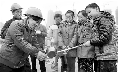 1月7日,翠庭园小学的留守儿童给工地外来务工人员盛腊八粥。