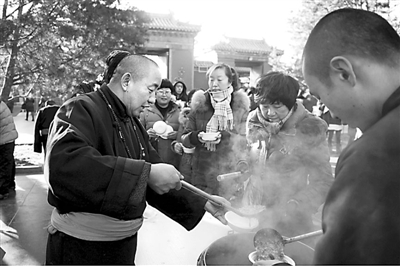 1月8日,腊月初八,北京雍和宫举行了舍粥活动,大批民众赶来争喝腊八粥。尽管当日不是周末,天气降温,但人们还是不畏严寒排起了数百米长的队伍。雍和宫早晨9时开门舍赠,截至上午11时,共有4500余人来到雍和宫。本报实习生 鲜康 摄