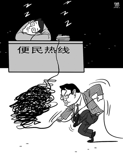 目前,各地各级政府公布了不少便民服务和应急电话,然而常有一些热线电话成为摆设,没有发挥应有的作用,影响了政府的形象。北京市的上述规定可谓疏通热线“堵点”之举,既有利于群众反映问题,也有利于监督政府的行政行为。希望北京市的规定能够真正落地,也希望更多地方的此类热线电话确实能畅通起来。 □赵春青/画 小郭/文