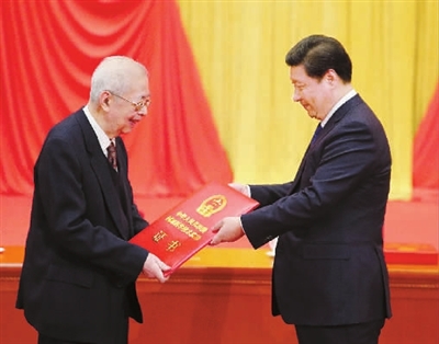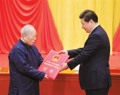 习近平向获得2013年度国家最高科学技术奖的中国科学院院士程开甲颁奖。 新华社记者 兰红光 摄