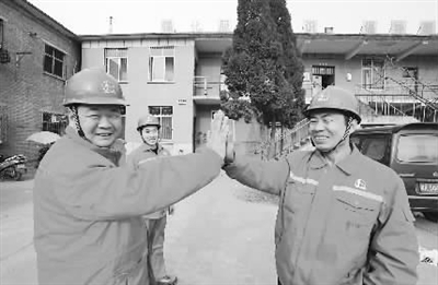 “你们敢不敢再和我们班比个一百天?”“比就比,我们会怕吗?”2104年初,得知本班在去年的劳动竞赛中各项生产指标和外线三班不相上下后,河南油田水电厂外线一班班长张华旭(左一)找到外线三班班长张晓勇,要求在新的一年里一决高下。李如飞 摄