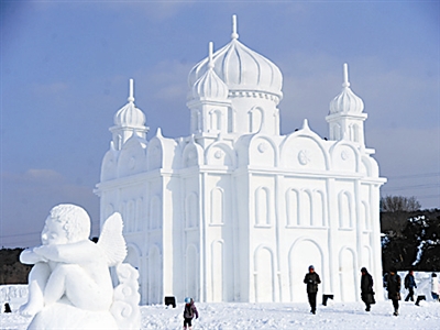 1月12日,游客在沈阳棋盘山欣赏精美的雪雕作品。