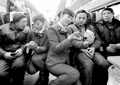1月12日,动车乘务员通过站车无线交互系统信息为农民工旅客宣传购票知识。