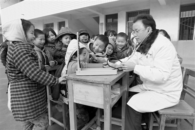 1月8日,在四川省广安市广安区郑山乡合同村小,郑山乡医院医务工作者正在给留守学生进行健康体检。据介绍,广安区有3万名留守学生进行了免费健康体检。