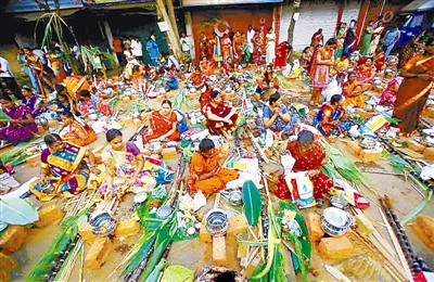 当地时间1月14日,印度孟买,印度教女性在户外进行集体烹饪,庆祝丰收节到来。丰收节也叫“庞格尔节”,已有1000多年历史。丰收节将持续4天,节日期间,家家户户要做甜牛奶米粥敬奉太阳神,尔后全家分食。阿健 供图
