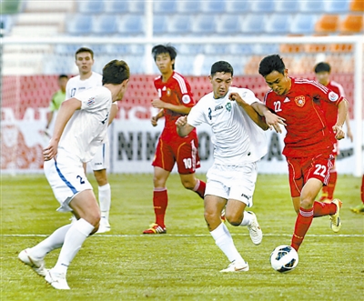 中国足球的后备人才现状让人担忧。图为1月12日,中国队球员吴兴涵(右)在比赛中带球进攻。在当日进行的首届男足U22亚洲杯D组的一场比赛中,中国队以1比2不敌乌兹别克斯坦队。新华社发 (穆罕默德 摄)