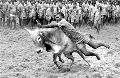 当地时间2014年1月15日,印度帕拉梅杜,这里正在举行传统的驯牛赛活动,据悉这项运动是新年丰收节的一部分。