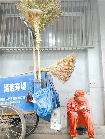 2013年9月23日,北京,一环卫工在休息的时候看手机。