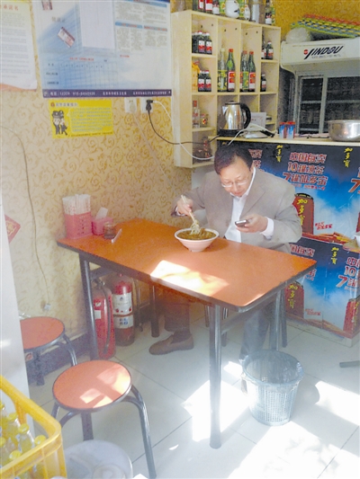 2013年9月26日,北京,一位顾客边吃饭边看手机。