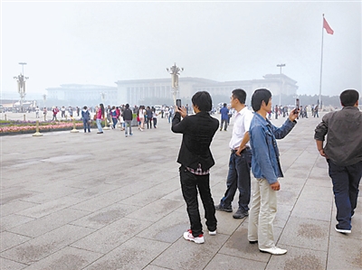 2013年9月9日,北京天安门广场,游客用手机拍照。