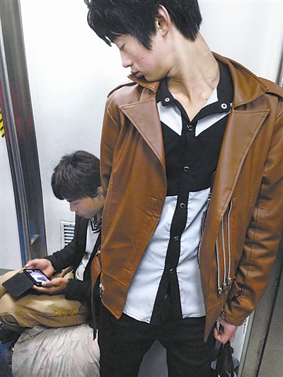 2013年10月14日,北京地铁内,一位乘客被旁边乘客的手机内容吸引,忍不住看几眼。