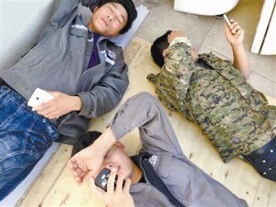 2013年10月11日,在河北曹妃甸一企业,员工躺在木板上午休,睡前不忘玩手机。