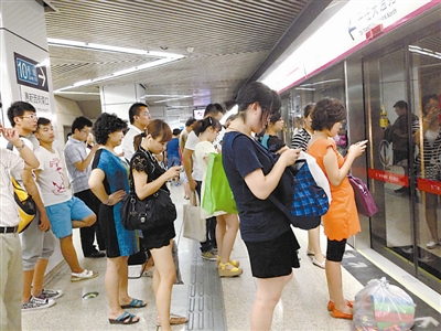 2013年8月20日,北京,等待地铁的乘客在看手机。