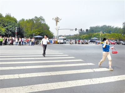 2013年9月9日,北京长安街上,两位年轻人在闯红灯时仍不忘打电话。