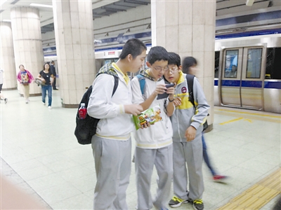 2013年9月25日,北京地铁站,三位放学的学生凑在一起玩手机游戏。